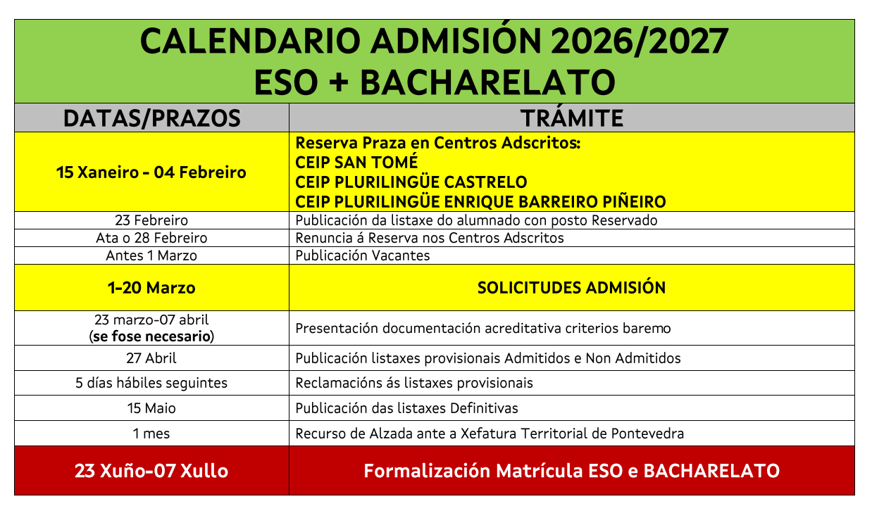 O alumnado procedente destes Centros, deberá solicita-la súa admisión no Centro de Orixe, segundo as instruccións e nos prazos que neles lles indiquen.